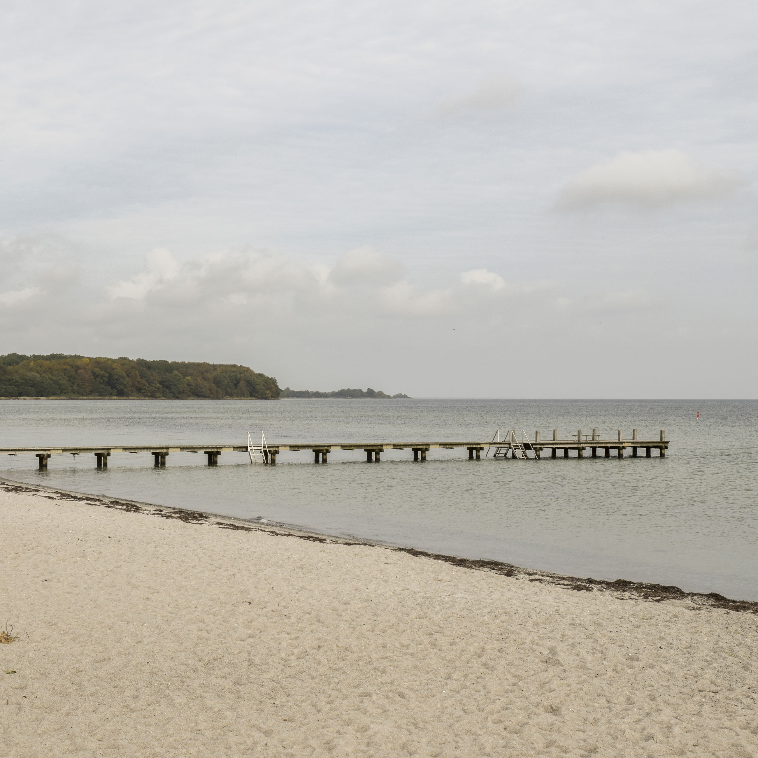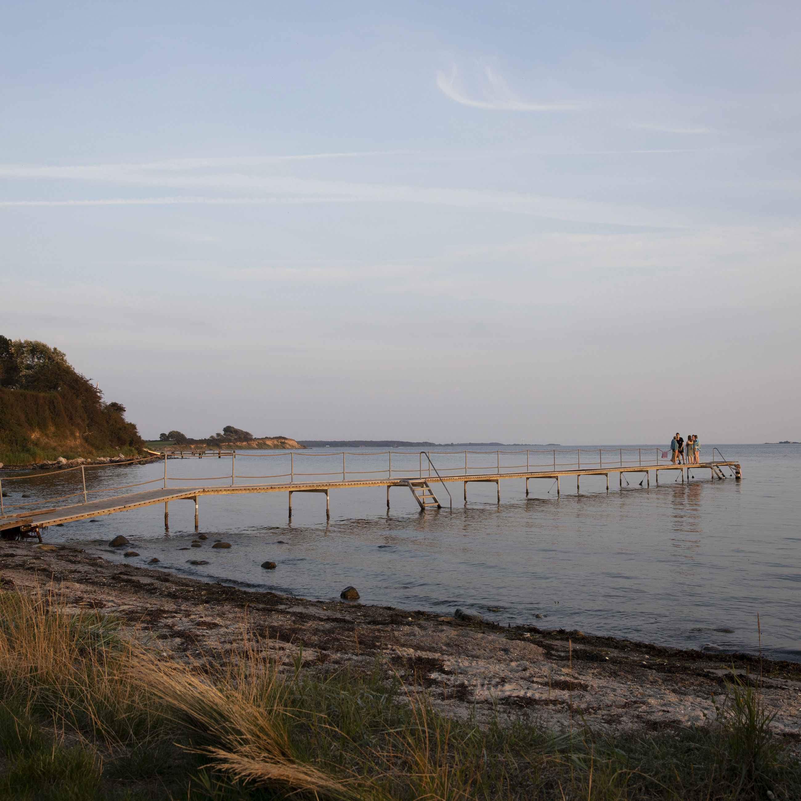 Stranden er børnevenlig med lavt vand og badebro i badesæsonen.