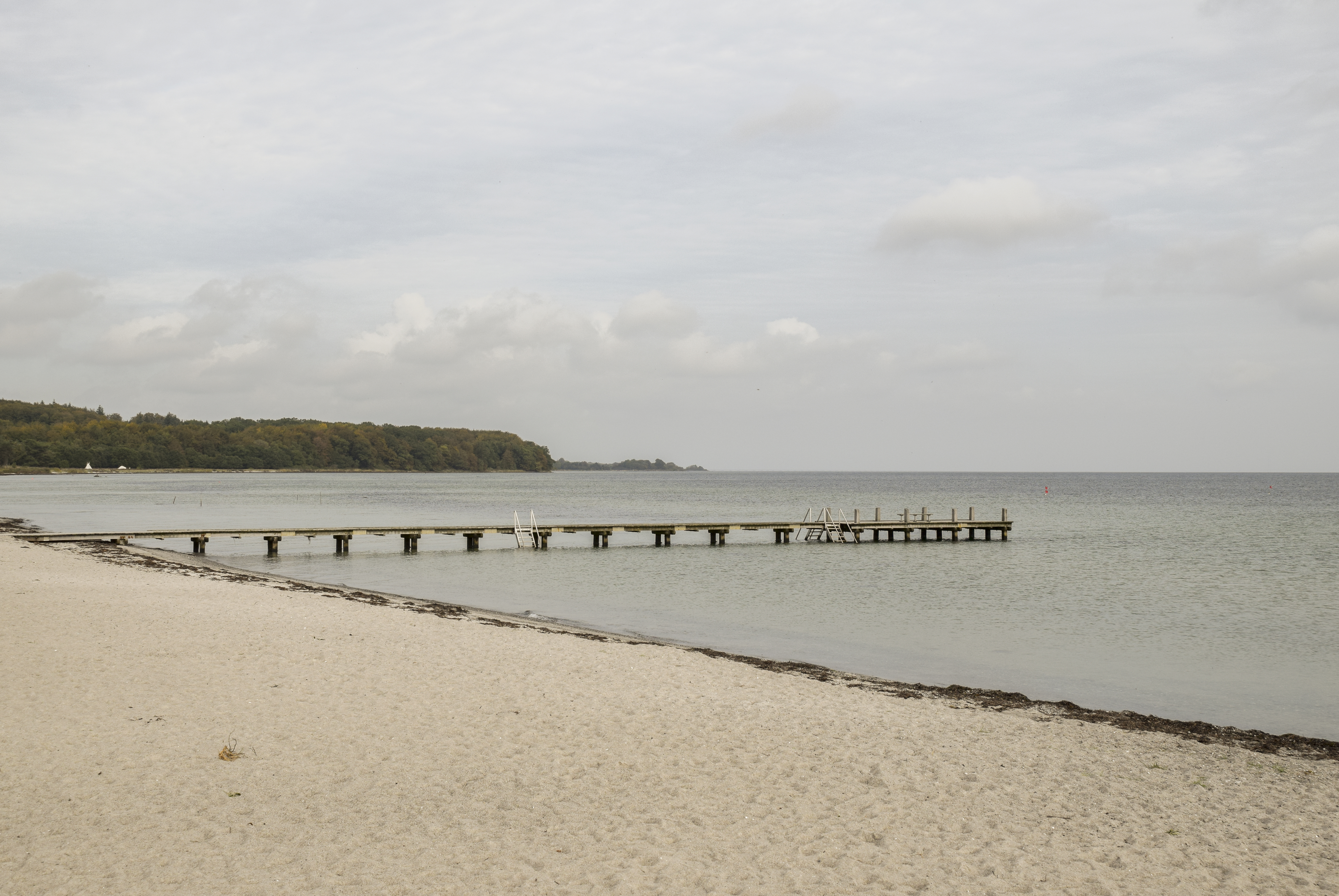 Stranden er børnevenlig med lavt vand og badebro i badesæsonen.